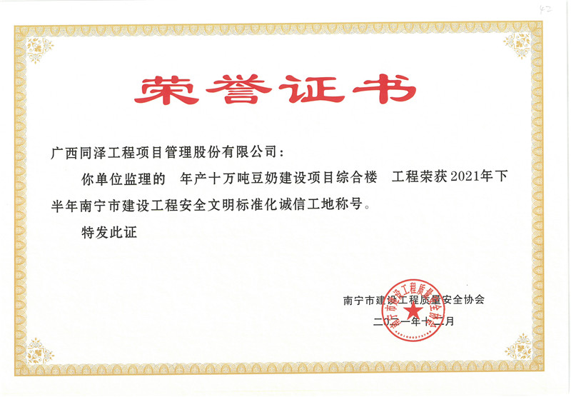 年產十萬噸豆奶建設項目綜合樓項目榮獲2021年下半年南寧市建設工程安全文明標準化誠信工地稱號
